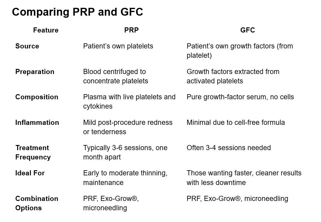 Choosing between PRP and GFC depends on your hair loss pattern, scalp condition, and goals: