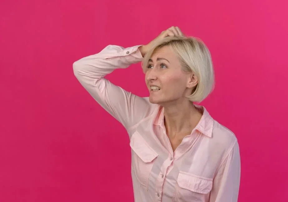 Woman touching her scalp with a concerned expression, representing hair thinning or scalp discomfort