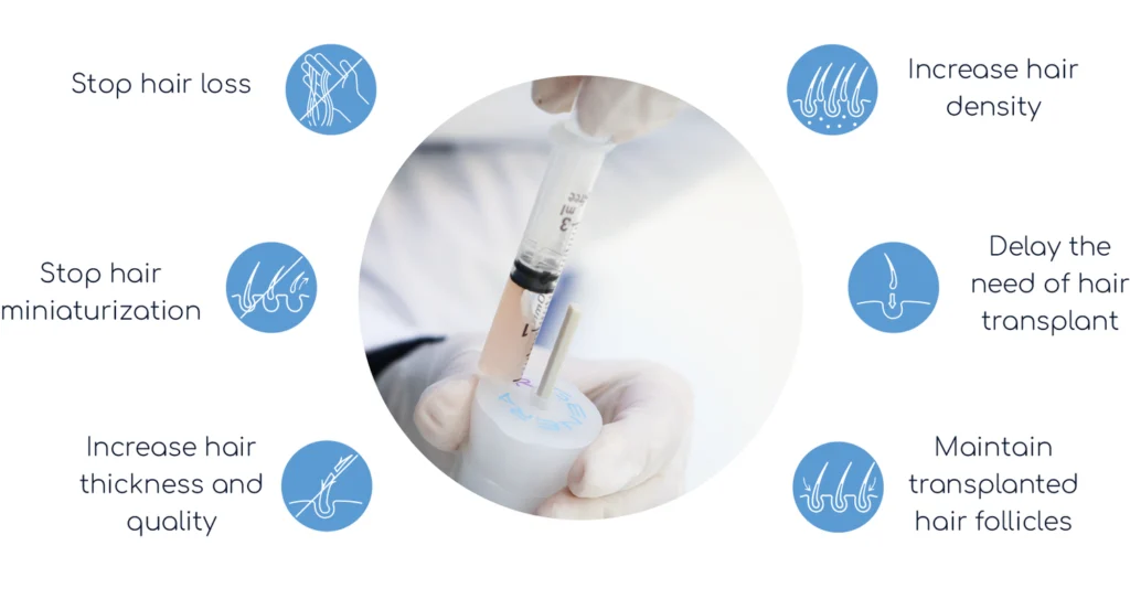 Effective and Long-Lasting Results: Approximately 80% success rate in increasing hair density and thickness Patients often begin to see initial improvements within a few weeks, with more noticeable results developing over several months as the hair growth cycle progresses. The treatment increases hair density and thickness, providing a natural and long-lasting solution to hair loss. Many patients enjoy the benefits for several years, although periodic maintenance treatments might be recommended to sustain optimal results.