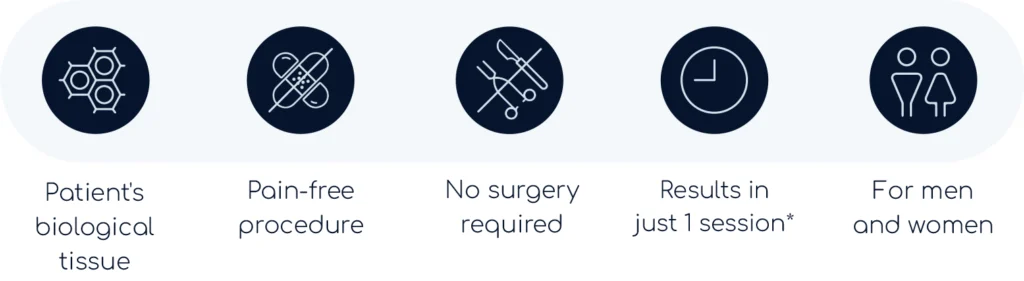 Minimally Invasive: The procedure is non-surgical and involves only minor tissue extraction and injections. This minimally invasive nature means less discomfort during and after the treatment, no need for stitches, and quick healing of small incisions.